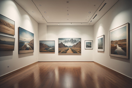Art gallery interior with landscape paintings hung on white walls and wooden floor