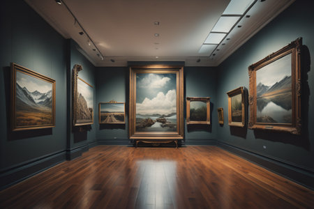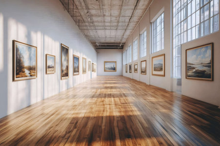 The museums hall is adorned with various artworks displayed on the hardwood flooring. The paintings are beautifully showcased in picture frames on the walls