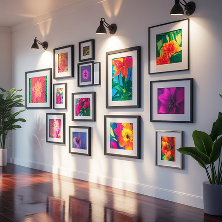 A collection of vibrant floral art pieces in various sizes and frames adorns a white wall, illuminated by modern wall lights.