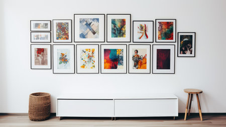 Art wall in a living room area with frames on it. Home decoration concept. Generative AI
