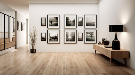 3d rendering of black and white picture frames hanging on the wall