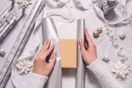 Womens hands are wrapping a Christmas present in silver wrapping paper.