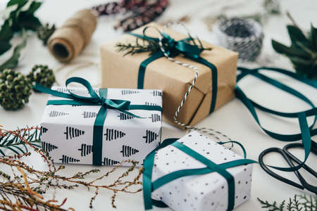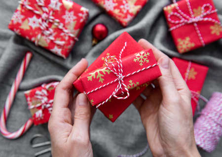Christmas or New year gift packing. Holiday decor concept.