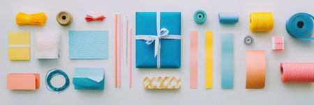 Vibrant arrangement of wrapping paper, ribbons, and cards on a flat surface with ample space for personalized messages or designs.