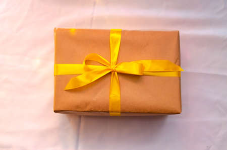 Cardboard carton package wrapped with light brown paper and tied with pink string ribbon in bow. Craft paper texture on white background. Gift present holiday birthday concept.