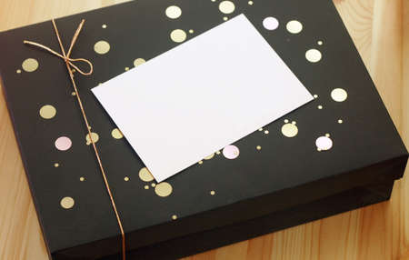 Beautiful gift black box with golden ribbon and bow, confetti and empty card for text. Bokeh festive effect.
