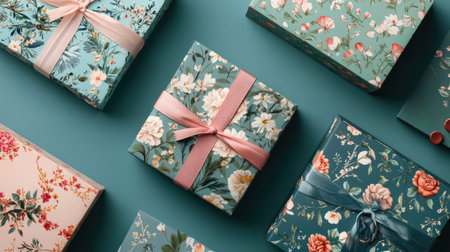 This image features elegantly wrapped gifts adorned with floral patterns against a soothing blue background, perfect for celebrations and special occasions.