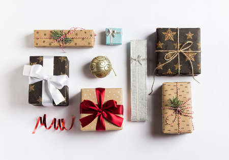 Christmas holiday gift box new year on white background. Packaging gift wrap and ribbons, twine. Winter time new year