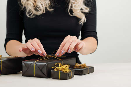 Close-up high-angle view of unrecognizable young woman tying ribbon on wrapped Christmas gift box with presents for family and friends. Preparing for xmas, new year and winter holidays, festive mood.