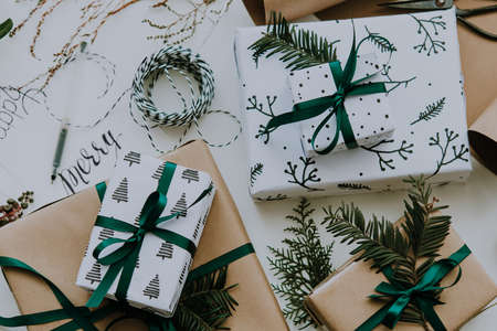 Preparation of Christmas gifts. Gift boxes are packed with kraft paper decored branches fir. to-do list for winter holidays. Xmas background. Still decor. Natural ornament. Top view. DIY hobby