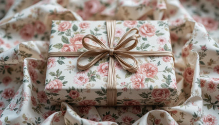 Delicate floral gift box lies on crumpled fabric, looking inviting and ready for a special occasion.