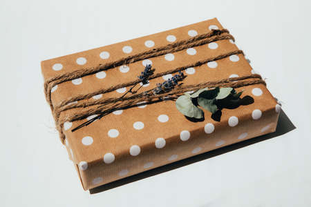 The gift is wrapped in kraft paper with white circles, tied with twine, decorated with dry lavender and eucalyptus. Top view