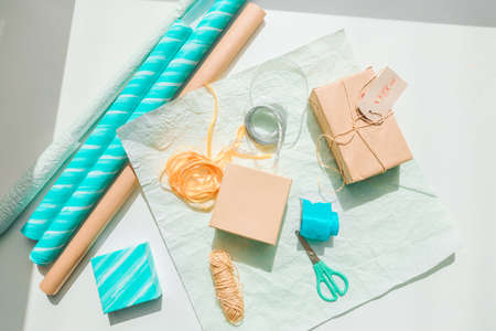 Various items for gift wrapping are on the table. Gifts already packed. Cone, wrapped books