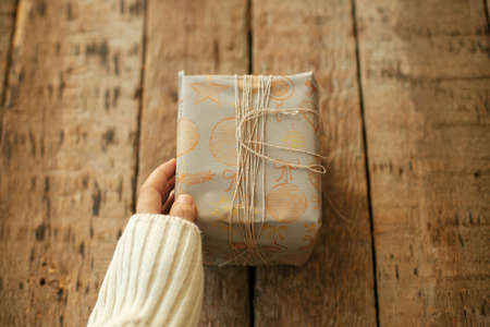 Hand holding stylish christmas gift wrapped in grey paper with thread on rustic wooden table. Happy holidays. Merry Christmas and Happy New Year. Simple xmas present