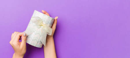 Flat lay of woman hands holding gift wrapped and decorated with bow on purple background with copy space. Christmas and holiday concept.