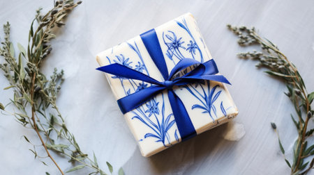 a wrapped gift featuring handmade paper and a blue ribbon adorned with eucalyptus flowers. the intricate floral prints on the paper complement the blue and white glaze of the minimalist ceramics. captured with the tokina opera 50mm f14 ff lens, the photo showcases bold and dynamic lines. this unique gift is a true embodiment of edwardian beauty, despite being made of cheese. ai generated