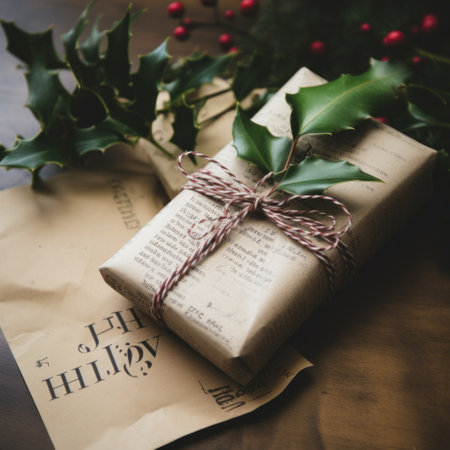 Gift wrapped in paper with red berries and green foliage, Christmas holiday, background, copy space, AI generated