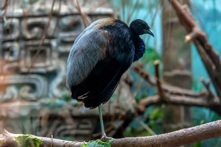 a large turkey perched on a branch, showcasing intense coloration in dark emerald and light crimson. this stunning photograph by matthias haker captures the exotic beauty of the bird, with its dark emerald and dark brown feathers. the composition evokes a sense of prehistoricore and is reminiscent of the angura kei style. ai generated