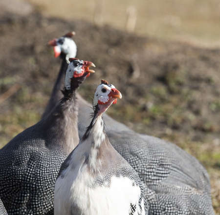 Three guinea fowls at eye level in Namibia, Africa