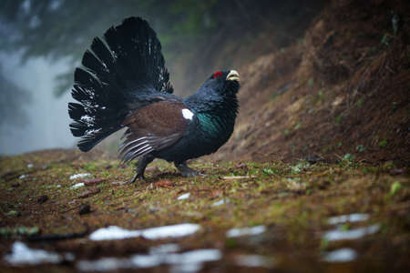 The western capercaillie - Tetrao urogallus, also known as the Eurasian capercaillie, wood grouse, heather cock is a heavy member of the grouse family and the largest of all extant grouse species