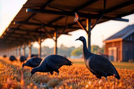 Guineafowl foraging in a field at sunrise with a butterfly in the air.