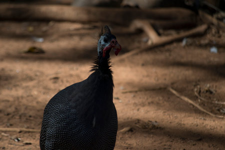 Guinea fowl bird or helmeted guinea fowl with white spotted feathers, selective focus
