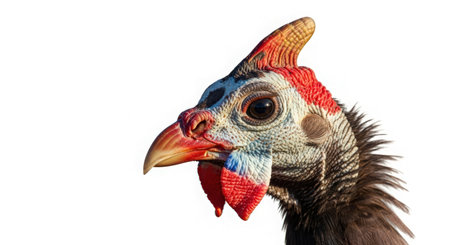 Close-up portrait of a guinea fowl isolated on black background
