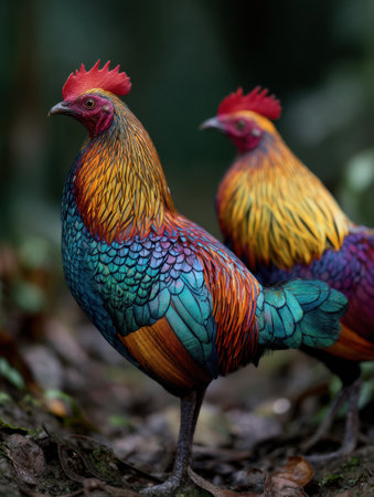 Colorful Sri Lankan junglefowl stand amidst foliage, displaying bright feathers and engaging in natural behaviors under clear morning light.