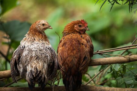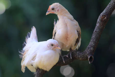 Two chicks are perched on the stem of a vine. This animal has the scientific name Gallus gallus domesticus.