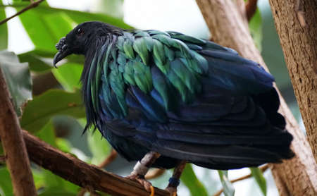 A Nicobar Pigeon with beautiful green and blue feathers perching on a tree branch