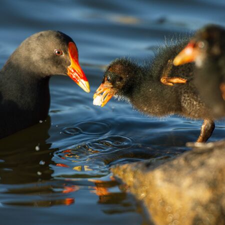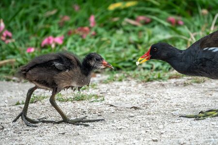 Common moorhen feeds its chick, Gallinula chloropus, water or swamp chicken.