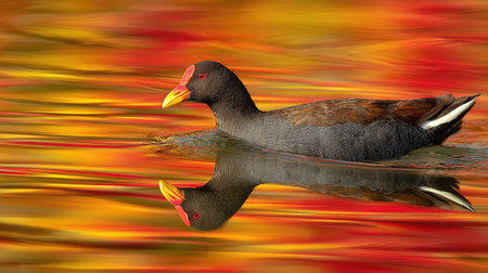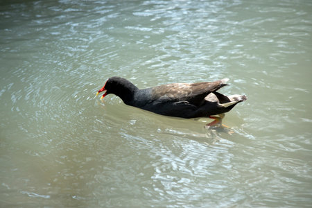 A black moorhen swims calmly across the surface of a lake. Gallinula chloropus swimming in water, a common bird found in wetland areas across Europe. The clear water reflects the sky in gentle waves.