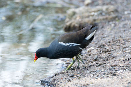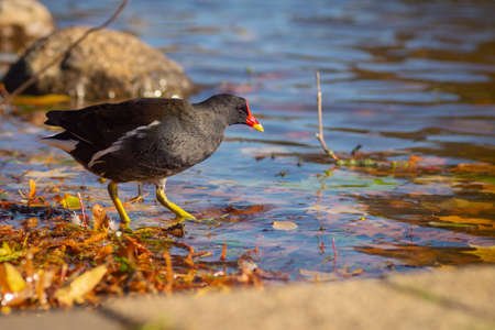 The common moorhen, black and brown bird with red and yellow beak and green legs, walking on dry leaves seeking for food. Blue water in the background.