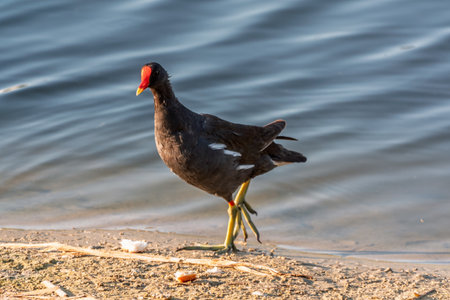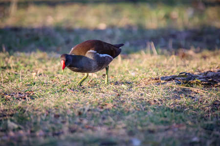 Common moorhen (Gallinula chloropus) looking for food on a meadow, sunny morning in sumnmer