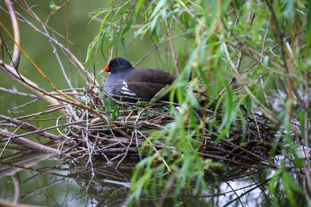 A breeding moorhen, a pond rail on its nest.