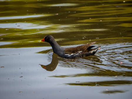 A common eurasian moorhen swims across a shallow pond in Yamato, Japan.