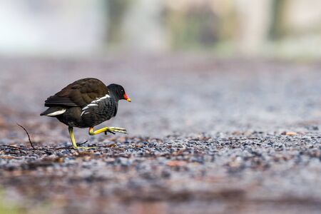 A Common Moorhen (Gallinula chloropus) walking on the ground
