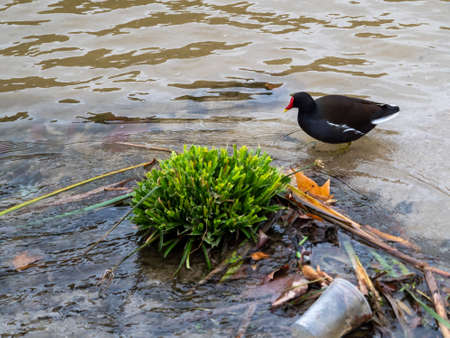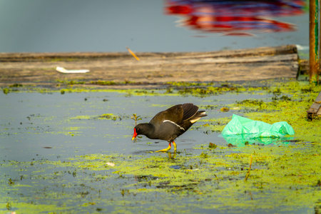 A Eurasian Moorhen (Gallinula chloropus) stands in the water in search of food. The natural environment around Dal Lake, Jammu and Kashmir, India.