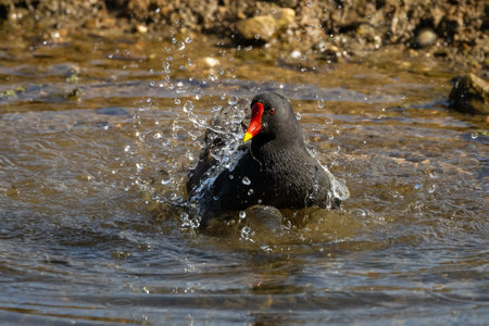 A Moorhen waterbird splashing in the water of a lake