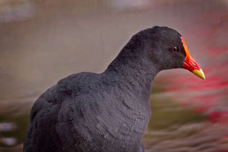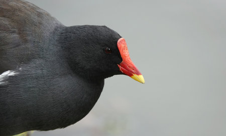 A closeup shot of a moorhen with red beak