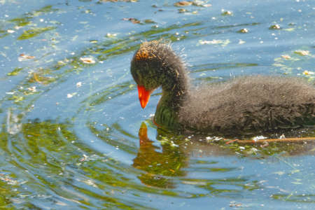 A juvenile Eurasian coot (Fulica atra) swimming in a freshwater pond in the middle of June.
