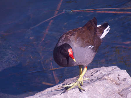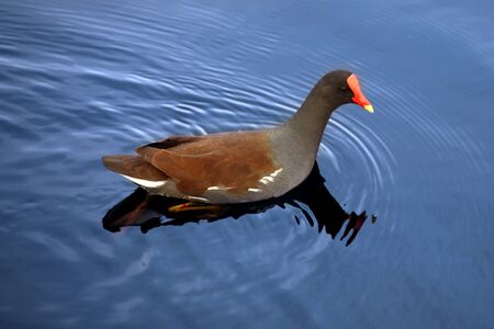 Beautiful Moorhen in the blue lake
