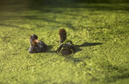 Two moorhens are in the green water. In the soft sunny morning light. With reflection ..