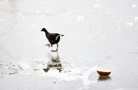 Common moorhen (Gallinula chloropus) walk on ice and eat bread. Waterhen or swamp chicken.