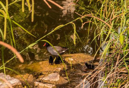 Common moorhen with her chicks on the lake shore