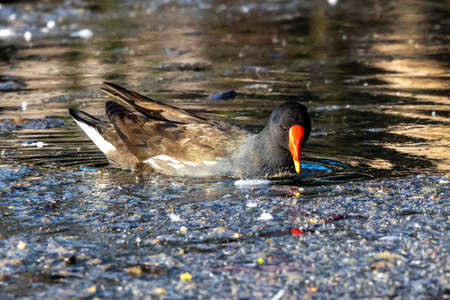 An adult common moorhen (Gallinula chloropus) swimming in pond, sunny day in summer, Vienna (Austria)