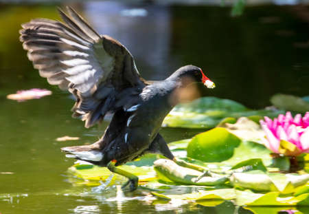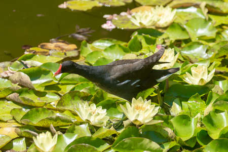 Common moorhen Gallinula chloropus it hides in the leaves of a water lily.