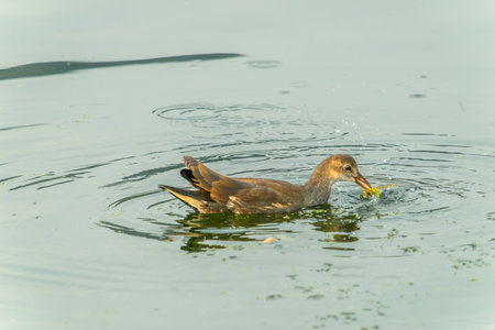 A juvenile Eurasian Moorhen swims in the water in search of food. The natural environment around Dal Lake, Jammu and Kashmir, India.