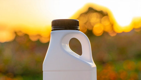 A white plastic jug with a black cap and handle is positioned in the foreground against a blurred golden sunset.