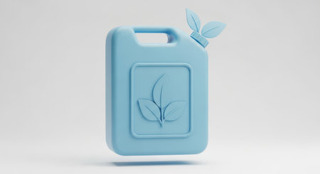 A minimalist light blue jerry can with a leaf emblem on the front and leaves on the cap, symbolizing eco friendly bio fuel or sustainable energy.